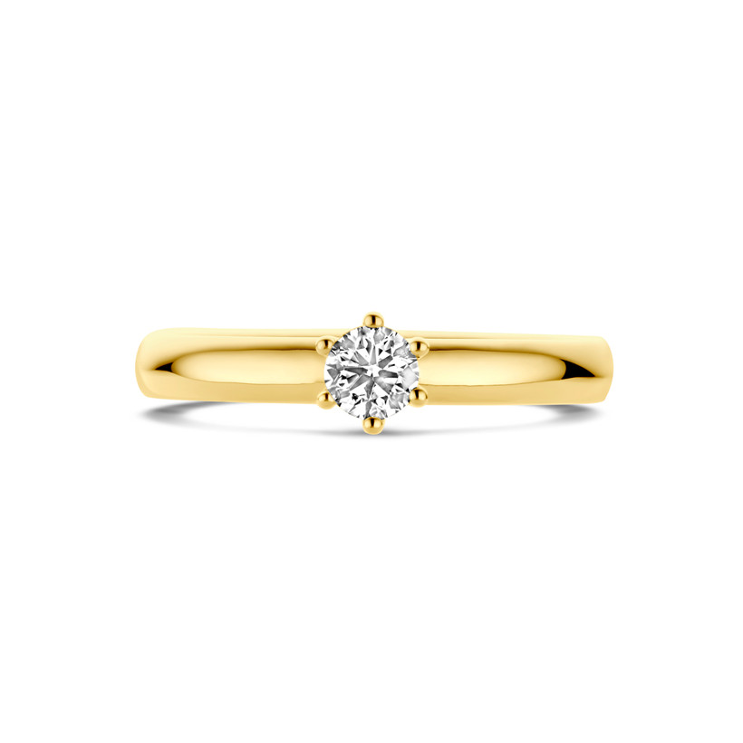 14k Geelgouden aanzoeksring uitgevoerd met diamant. De ring heeft een breedte van 5.5mm. De steenmaat is 4mm en het diamantgewicht is 0.25ct.