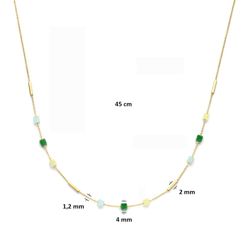 14k Geelgouden collier uitgevoerd met blauw en groen kwartsiet. Het collier heeft een draaglengte van 45cm.