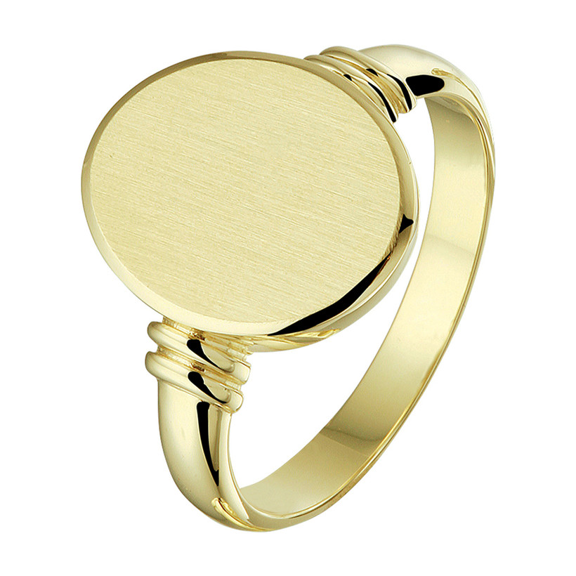 Stijlvolle geelgouden massieve graveerring met een afmeting van 15.5x12.5mm. De gediamanteerde afwerking en de robuuste afkanting maken de ring helemaal af.