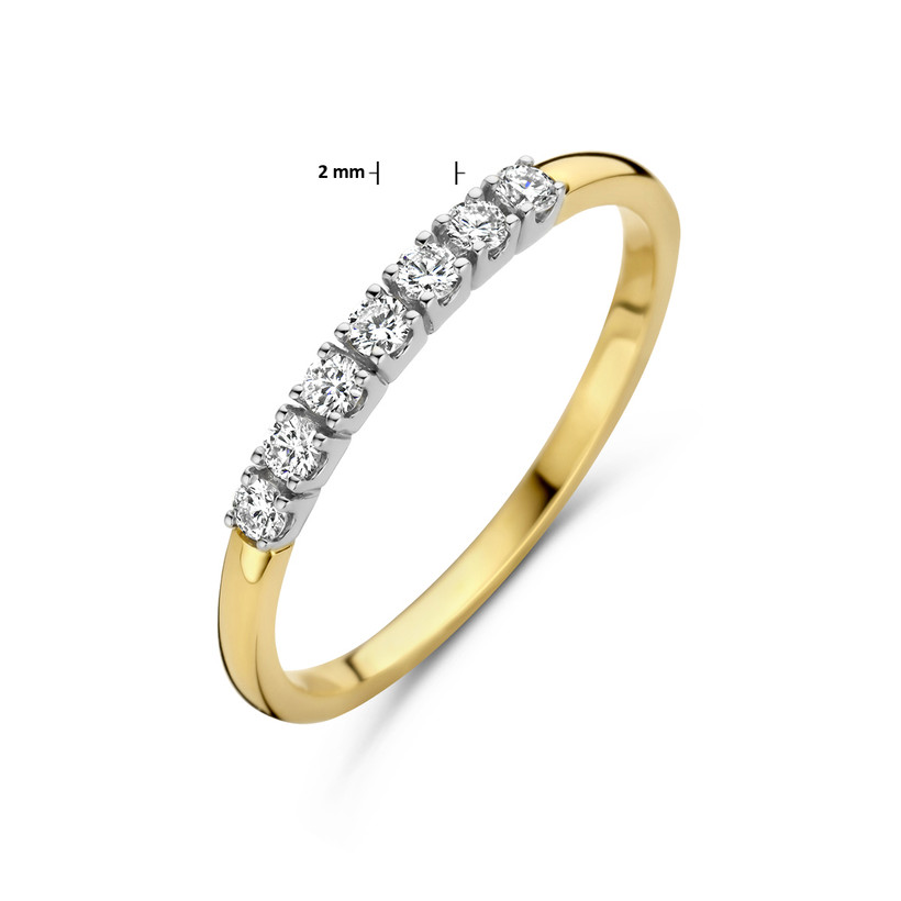 14k Bicolor geel- en witgouden ring uitgevoerd met een diamant rij. De ring heeft een breedte van 2mm.