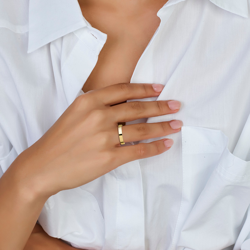 14k Geelgouden relatiering. De ring heeft een breedte van 3mm.