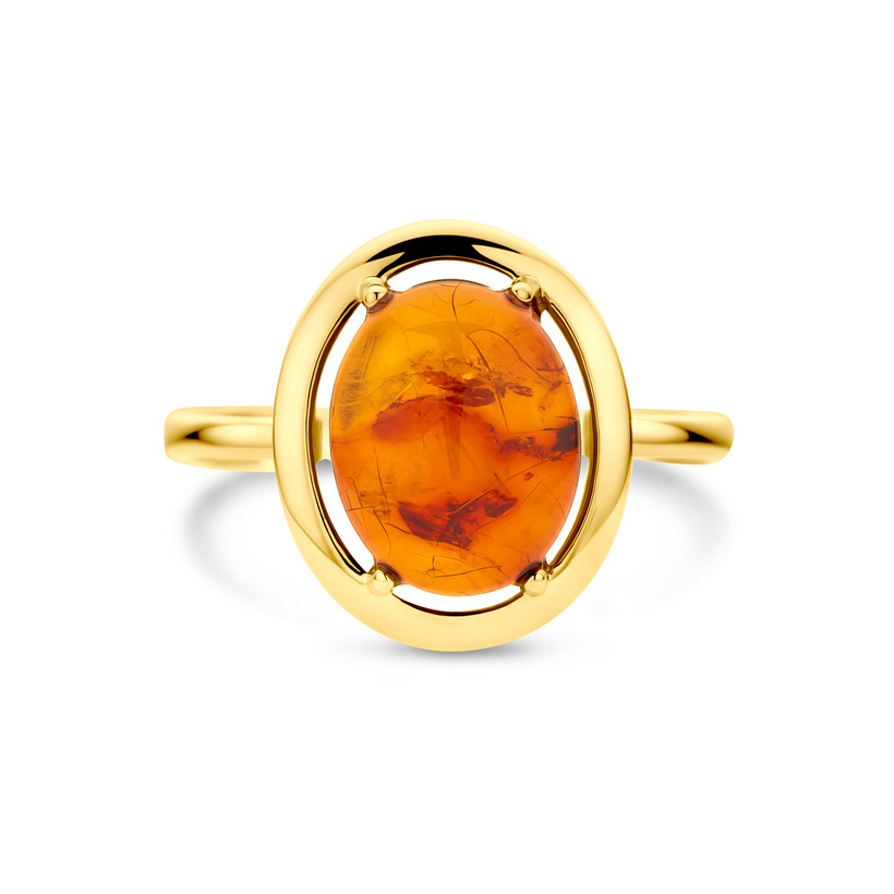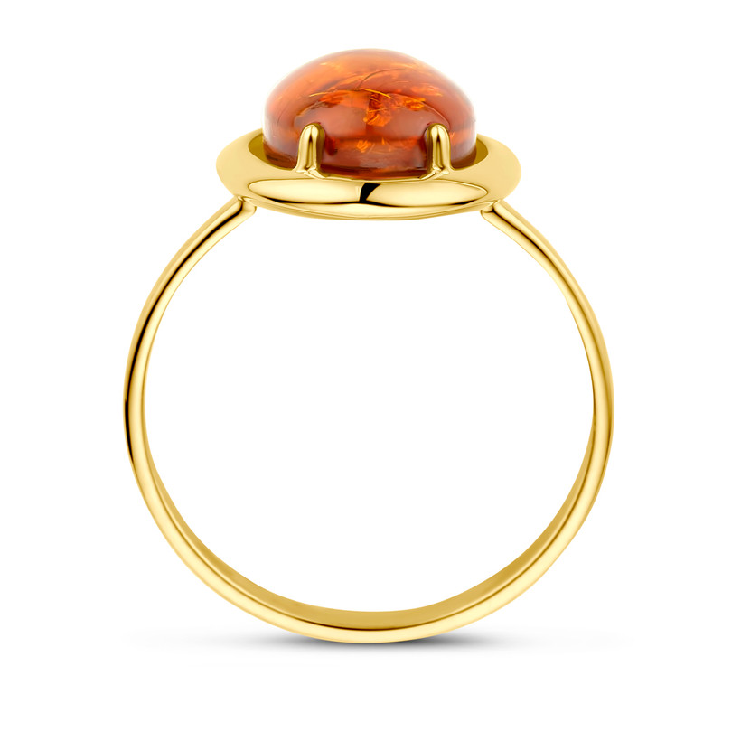 14k Geelgouden ring uitgevoerd met amber. De ring heeft een breedte van 14mm.