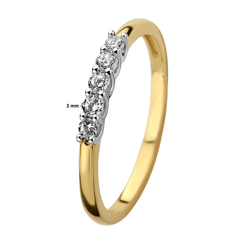 14k Bicolor geel- en witgouden ring met een schitterende zirkonia rij. De ring heeft een breedte van 2mm.