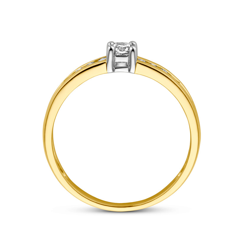 Stijlvolle bicolor geel- en witgouden ring met een schitterende rij van zirkonia. Tip: Combineer deze ring met bijpassende sieraden uit onze collectie of vanuit je eigen stash en creeer zo elke keer weer een nieuwe look.