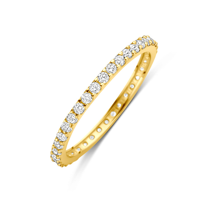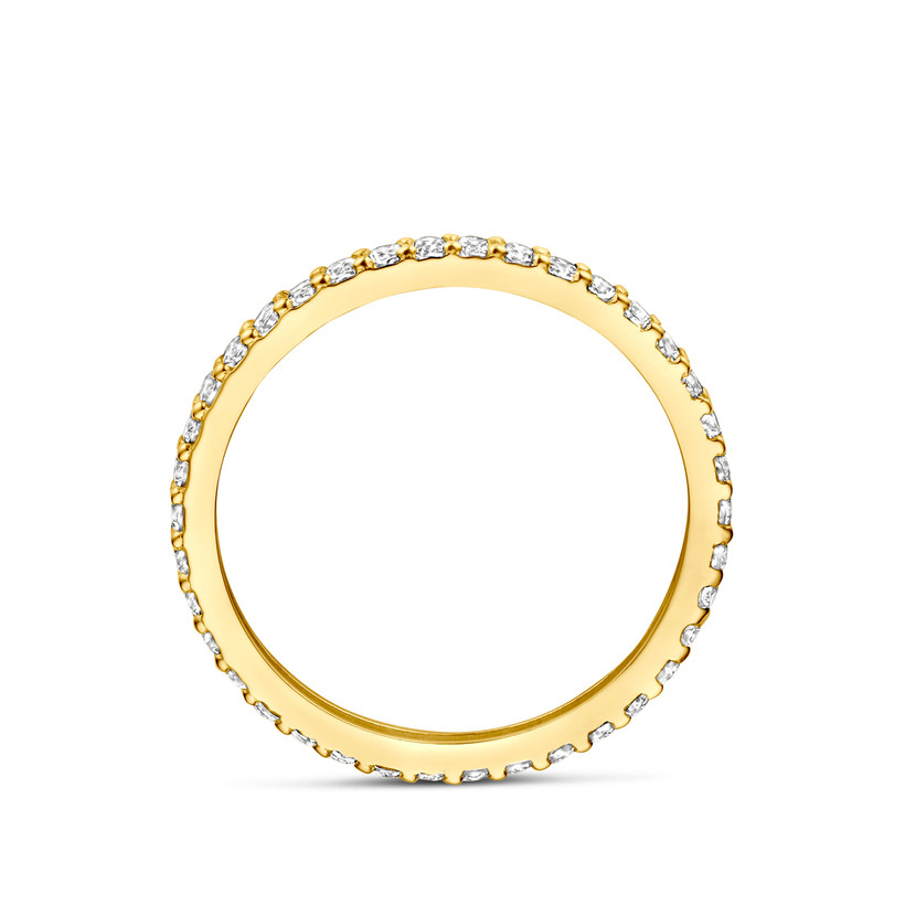 14k Geelgouden ring uitgevoerd met zirkonia. De ring heeft een breedte van 1.5mm.