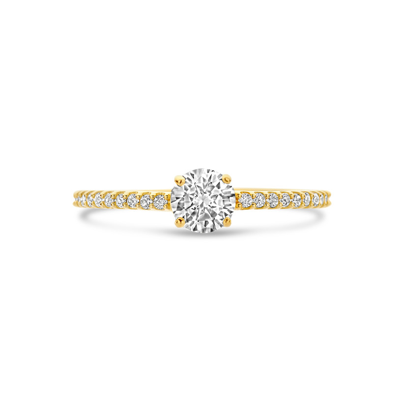14k Geelgouden ring uitgevoerd met zirkonia. De ring heeft een breedte van 5mm.
