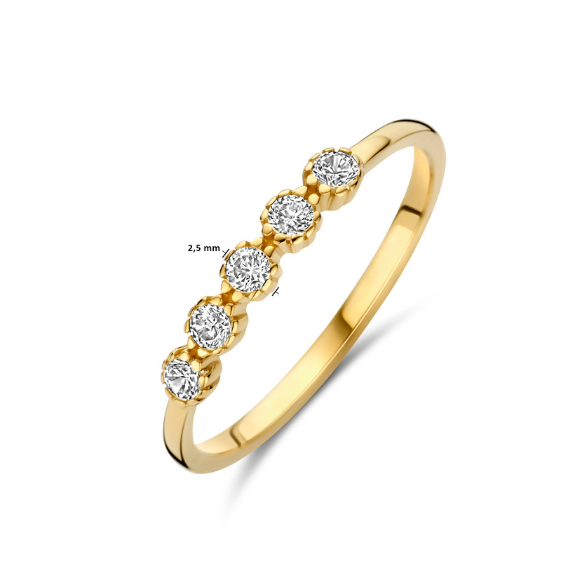 14k Geelgouden ring uitgevoerd met zirkonia. De ring heeft een breedte van 2.5mm.