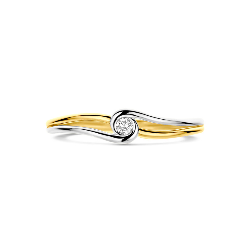 14k Geel en witgouden ring uitgevoerd met diamant. De ring heeft een breedte van 4mm en het diamantgewicht is 0.04ct.