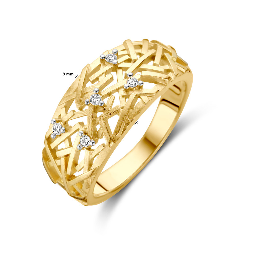 14k Geelgouden ring uitgevoerd met diamant. De breedte van de ring is 9mm. Het diamantgewicht is 0.06ct.