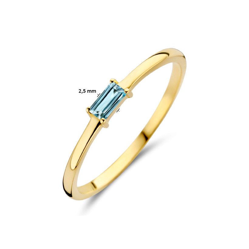 14k Geelgouden ring uitgevoerd met een schitterende aquamarijn. De ring heeft een breedte van 2.5mm.