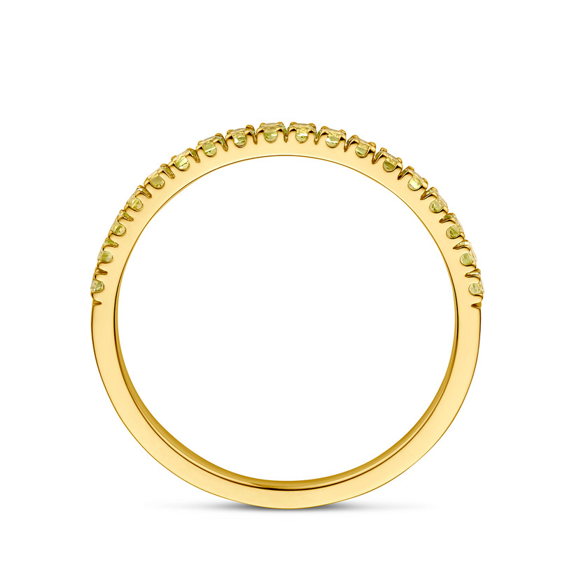 14k Geelgouden ring met geboortesteen uitgevoerd met peridoot. De ring heeft een breedte van 1.5mm.