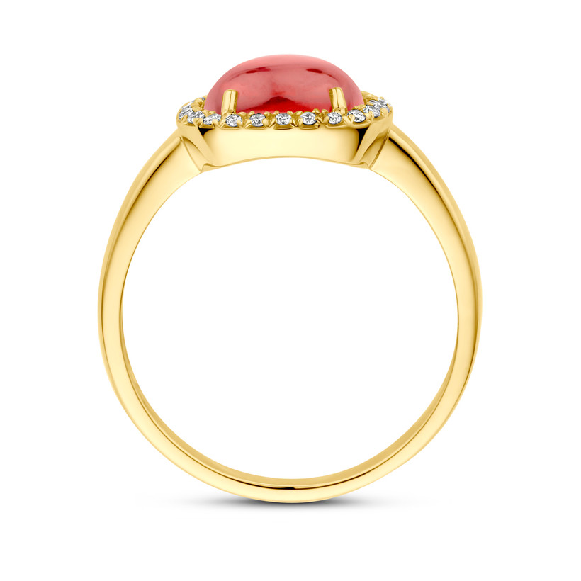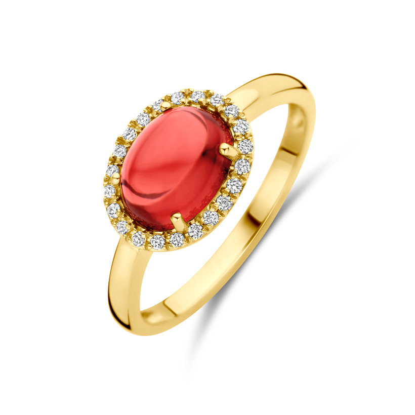 14k Geelgouden ring uitgevoerd met diamant en granaat. De ring heeft een afmeting van 8.5x10mm. De totale diamantgewicht is 0.09ct.