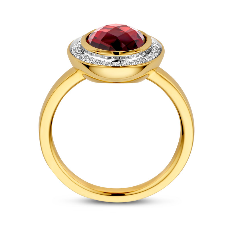 14k Geelgouden ring uitgevoerd met granaat en diamant. De ring heeft een afmeting van 15x13mm. De totale diamantgewicht is 0.18ct.