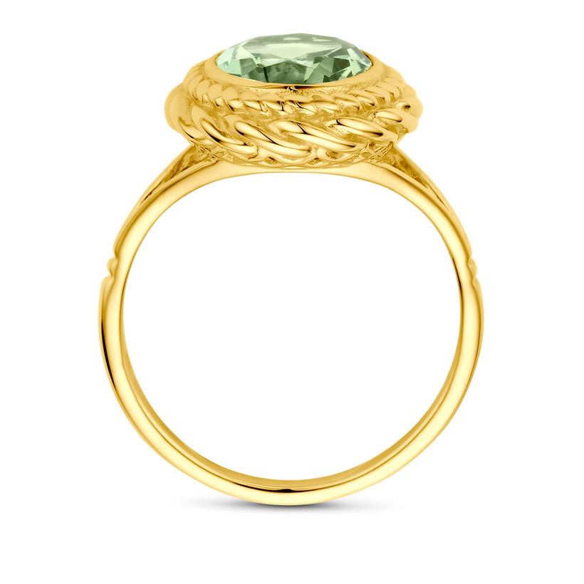 14k Geelgouden ring uitgevoerd met groen amethist. De ring heeft een afmeting van 15x13.5mm.