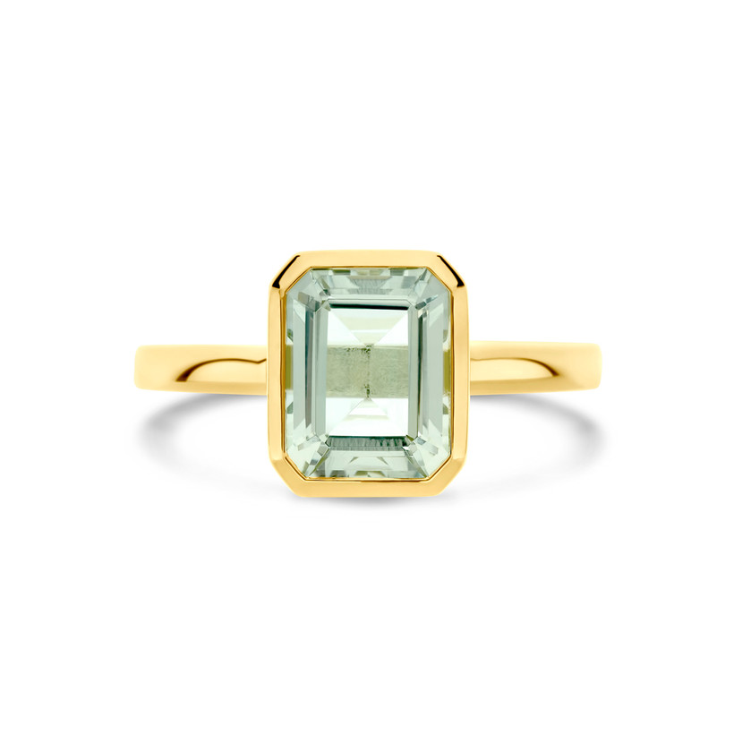 14k Geelgouden ring uitgevoerd met groen amethist. De ring heeft een breedte van 10mm.