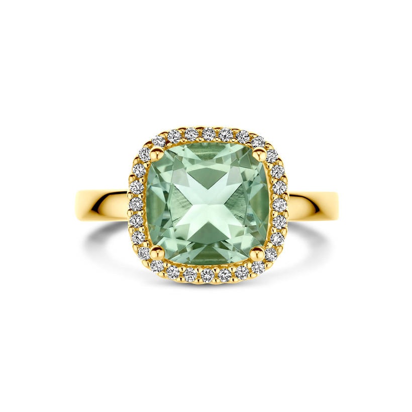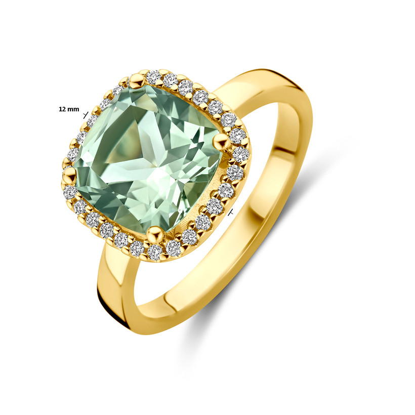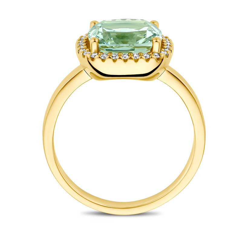 14k Geelgouden ring uitgevoerd met groen amethist en diamant. De ring heeft een afmeting van 12x12mm. Het totale diamantgewicht is 0.14ct.