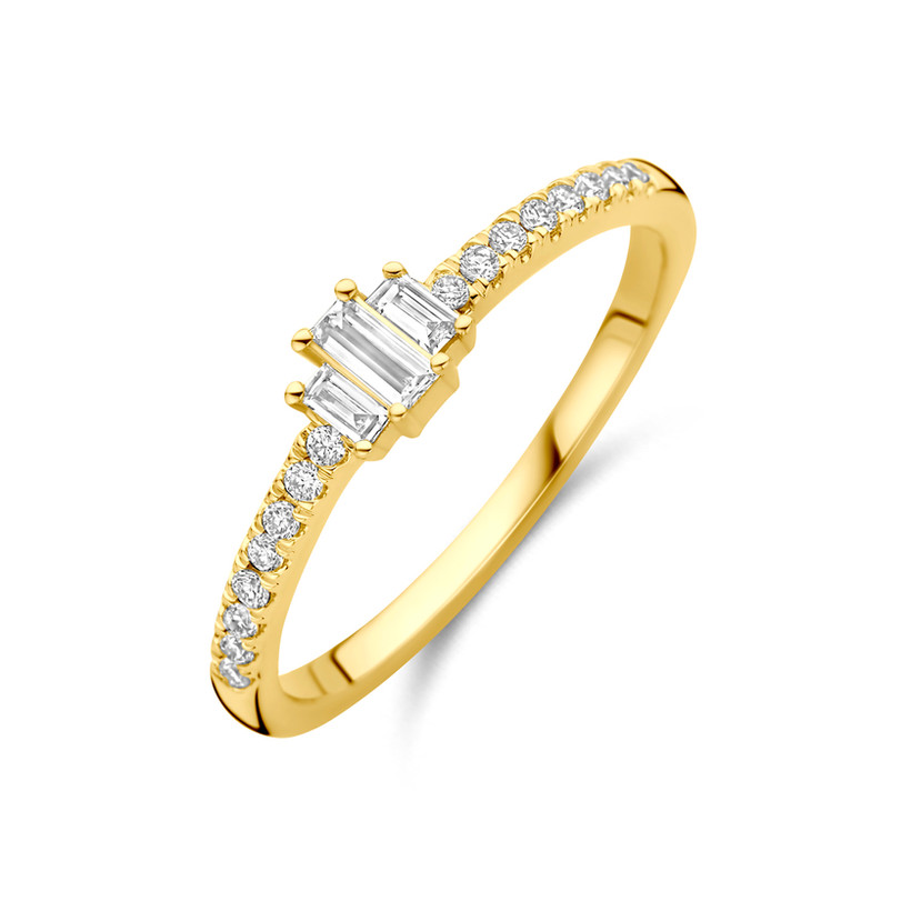 14k Geelgouden ring uitgevoerd met lab grown diamant. De ring heeft een breedte van 4.5mm. Het totale diamantgewicht is 0.21ct. Lab grown diamanten zijn diamanten die ontstaan in een laboratorium. Onder extreem hoge druk en temperatuur wordt het natuurlijk ontstaansproces nagebootst met als eindresultaat een diamant met dezelfde chemische eigenschappen maar met een andere oorsprong.