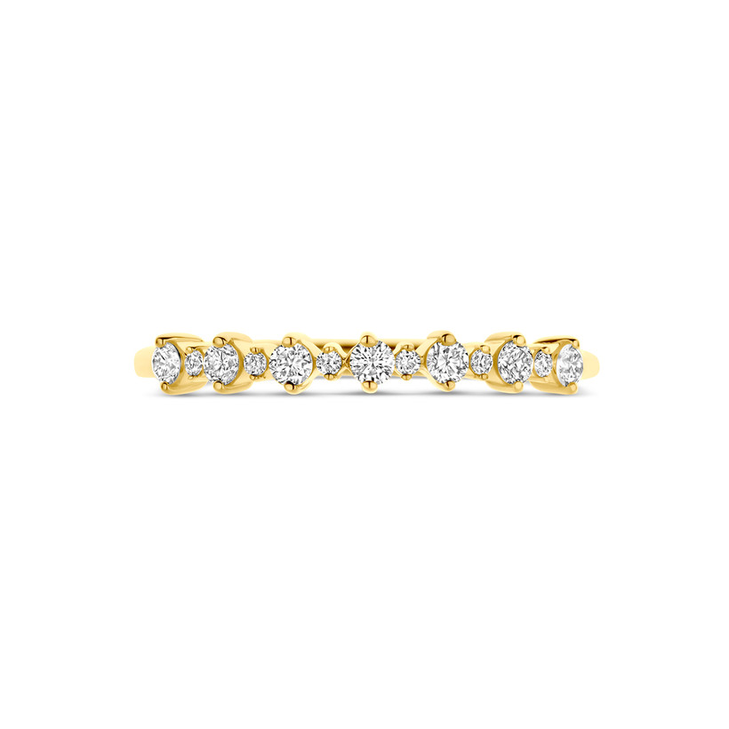 14k Geelgouden ring uitgevoerd met lab grown diamant. De ring heeft een breedte van 2.5mm. Het totale diamantgewicht is 0.23ct. Lab grown diamanten zijn diamanten die ontstaan in een laboratorium. Onder extreem hoge druk en temperatuur wordt het natuurlijk ontstaansproces nagebootst met als eindresultaat een diamant met dezelfde chemische eigenschappen maar met een andere oorsprong.