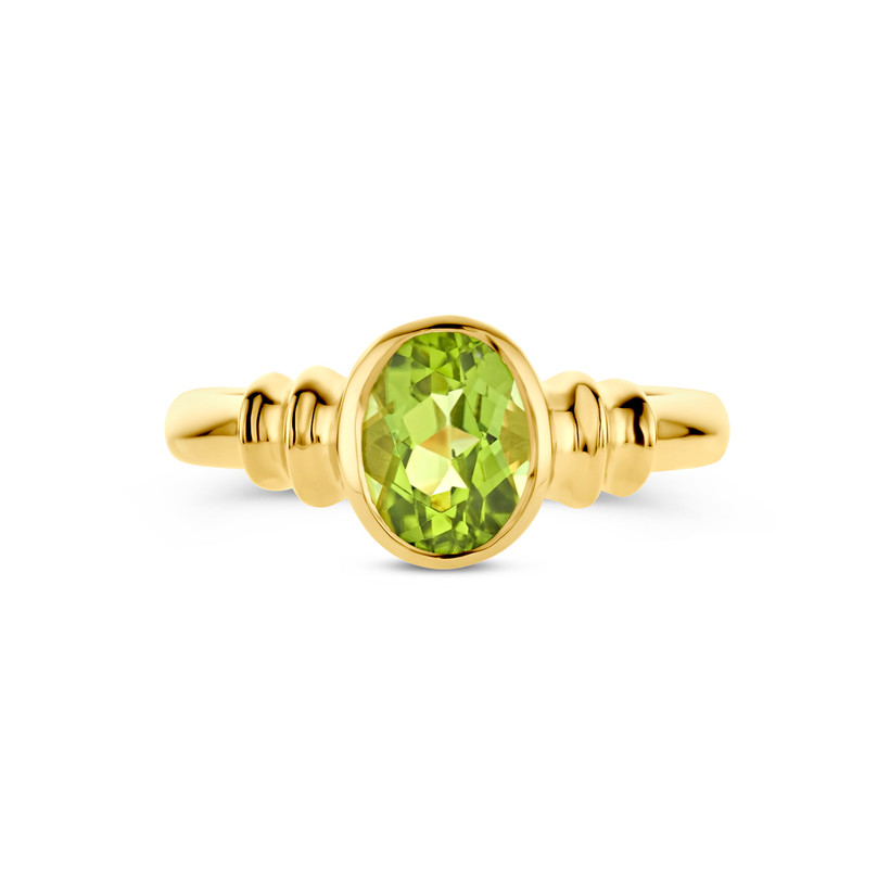 14k Geelgouden ring uitgevoerd met peridot. De ring heeft een breedte van 9mm.