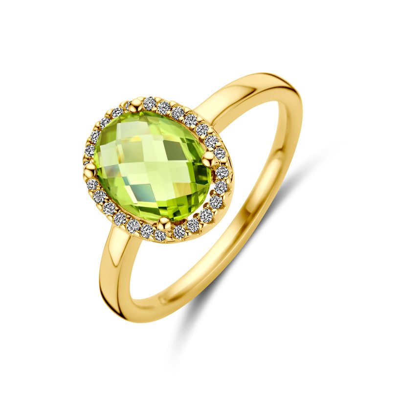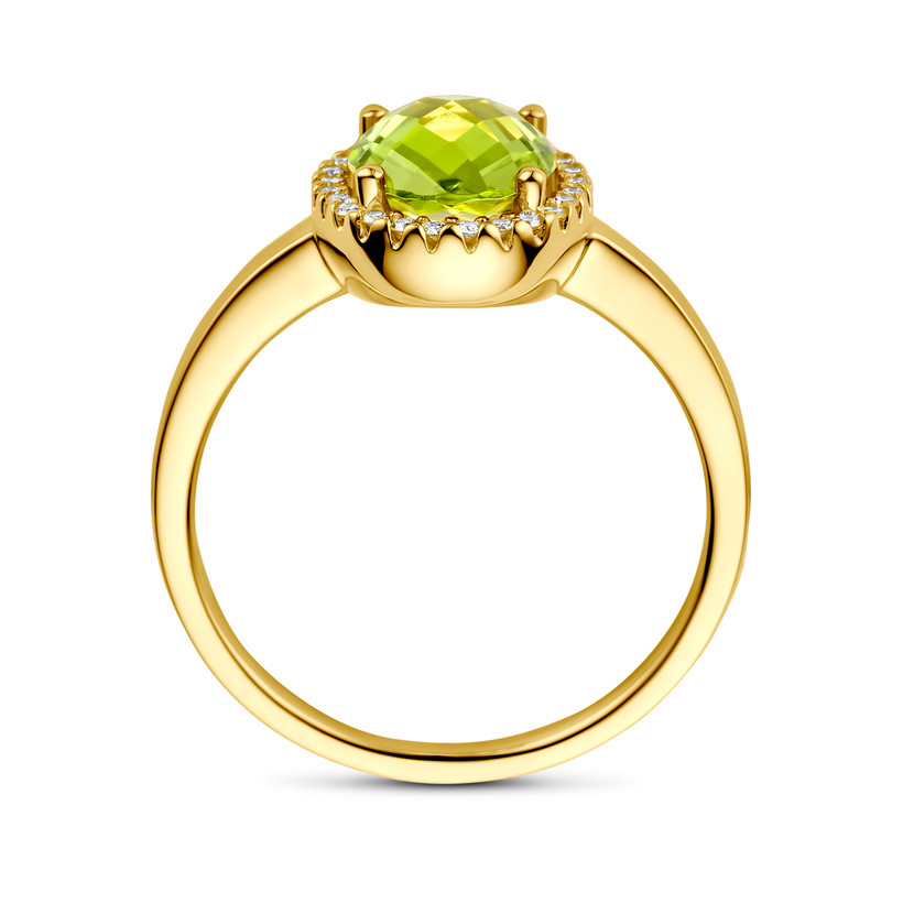 14k Geelgouden ring uitgevoerd met peridot en diamant. De ring heeft een breedte van 11.5x9.5mm. Het diamantgewicht is 0.10ct.