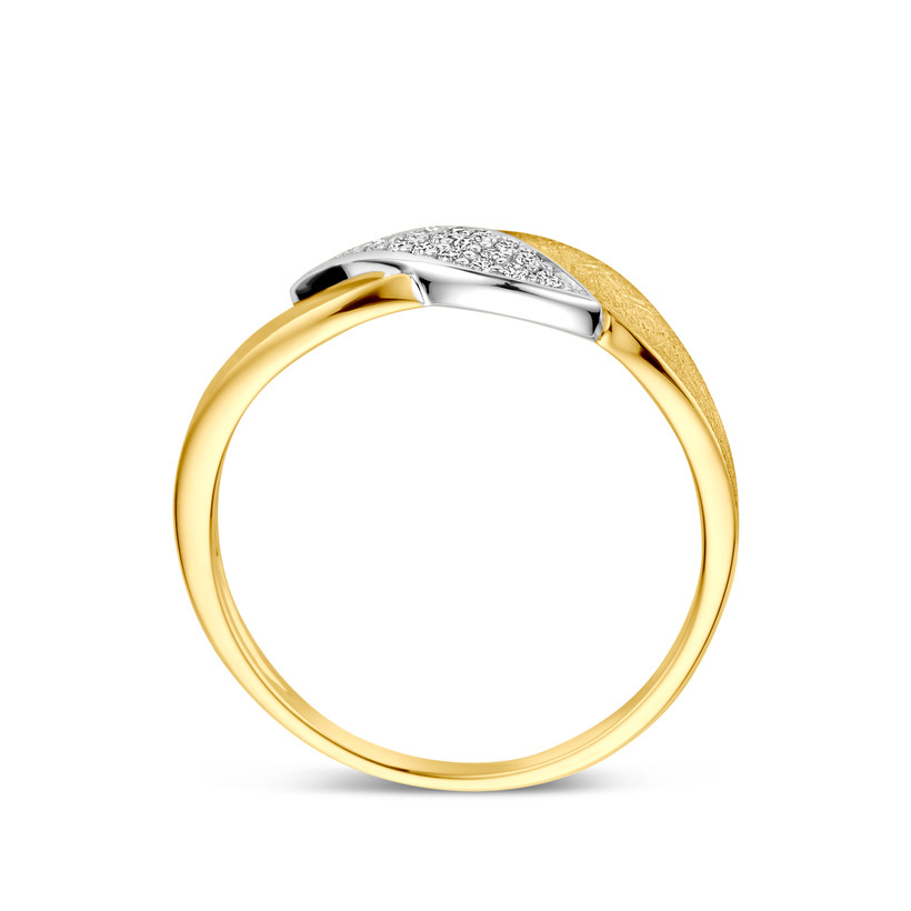 14k Bicolor geel en witgouden ring uitgevoerd met diamant. De ring heeft een breedte van 7mm. Het totale diamantgewicht is 0.08ct.