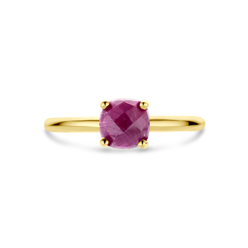 14k Geelgouden ring uitgevoerd met robijn. De steen heeft een afmeting van 6x6mm.