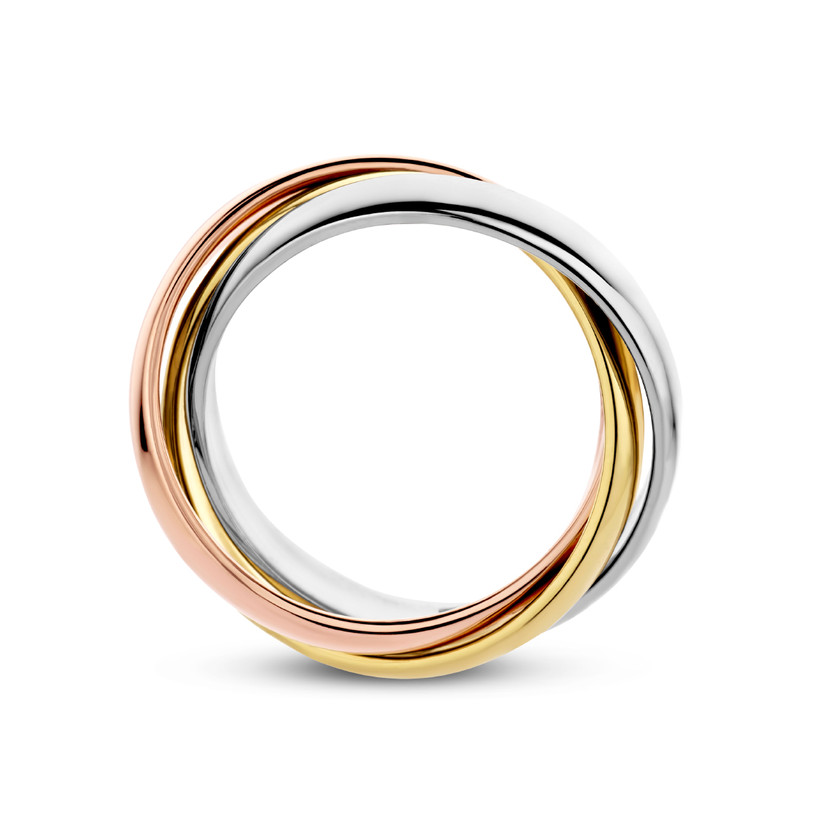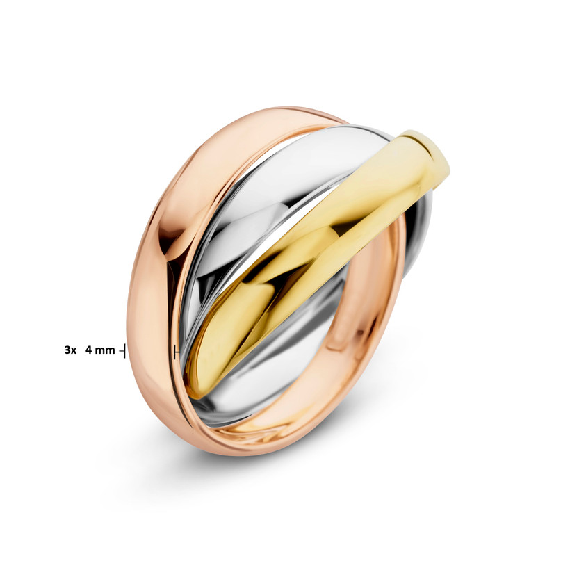 14k Tricolor wit, rosé en geelgouden ring. De ring heeft 3x een breedte van 4mm.